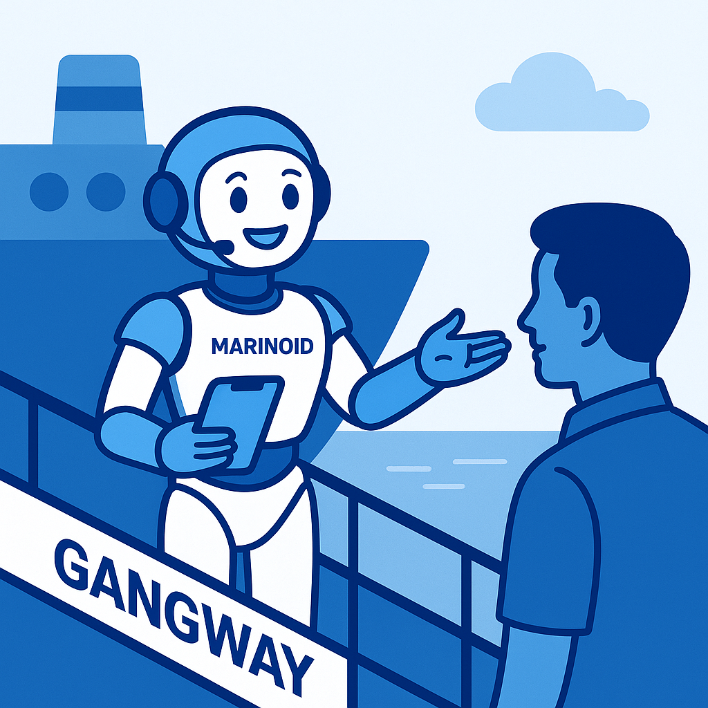 nAvI is the Industry’s first Marinoid — a robotic crew assistant that blends intelligence with presence.It handles gangway duties, monitors port ops, and helps the crew access SOPs, voice queries, or safety briefs — all hands-free.Always alert. Always onboard. Never off duty.